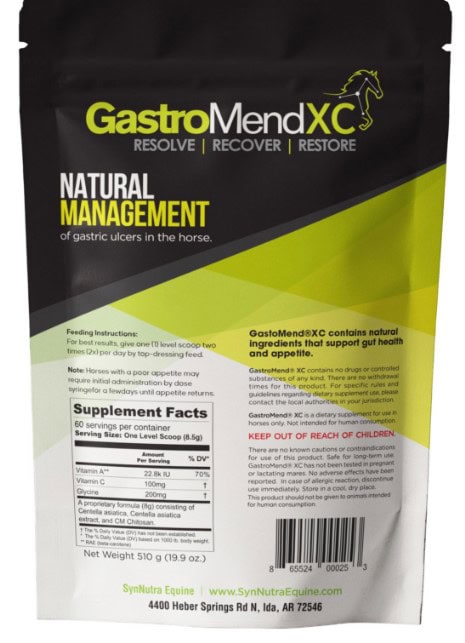 GastroMend XC from SynNutra Equine is a stomach supplement that is meant to help with ulcers. It contains vitamins A and C and can also support hindgut health.