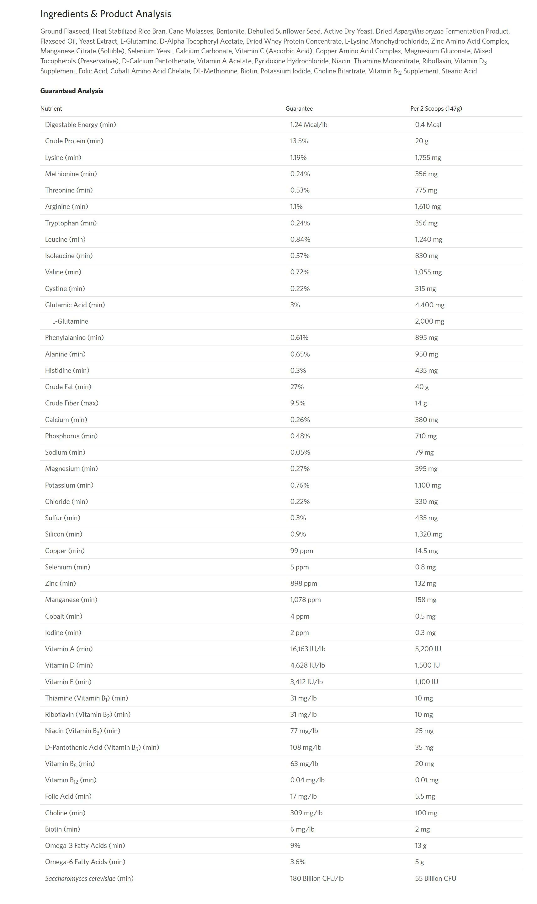 Ingredients: Ground Flaxseed (Linseed), Stabilized Rice Bran, Cane Molasses, Bentonite Clay, Sunflower Seeds, Active Dried Yeast, Dried Aspergillus oryzae Fermentation Product, Flaxseed (Linseed) Oil, Yeast Extract, L-Glutamine, d-Alpha-Tocopheryl Acetate, Whey Protein Concentrate, L-Lysine Monohydrochloride, Zinc Amino Acid Complex, Manganese Citrate, Selenium Yeast, Calcium Carbonate, Ascorbic Acid (Vitamin C Supplement), Copper Amino Acid Complex, Magnesium Gluconate, Mixed Tocopherols, Pantothenic Acid (Vitamin B5), Vitamin A Supplement, Pyridoxine Hydrochloride (Vitamin B6), Niacin (Vitamin B3), Thiamine Mononitrate (Vitamin B1), Riboflavin (Vitamin B2), Cholecalciferol (Vitamin D3), Folic Acid (Vitamin B9), Cobalt Amino Acid Chelate, DL-Methionine, Biotin, Potassium Iodide, Choline Bitartrate, Cobalamin (Vitamin B12)
