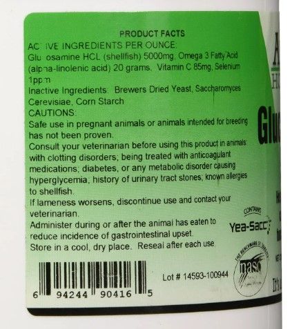 Ingredients: Glucosamine Hydrochloride, Omega 3 Fatty Acids, Ascorbic Acid (Vitamin C Supplement), Selenium, Brewers Yeast, Saccharomyces cerevisiae, Corn Starch
