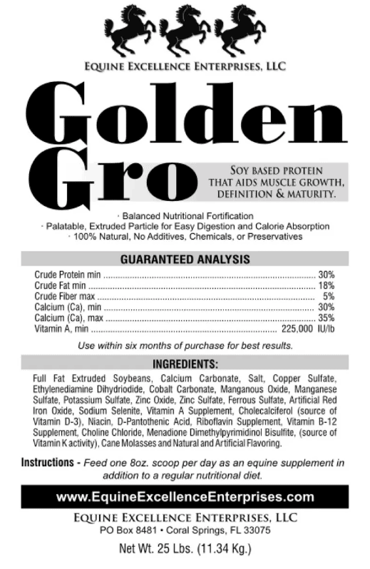 Golden Gro by Equine Excellence Enterprises is a protein supplement intended to assist with muscle, coat and hoof health. It contains 30% crude protein and 18% fat.
