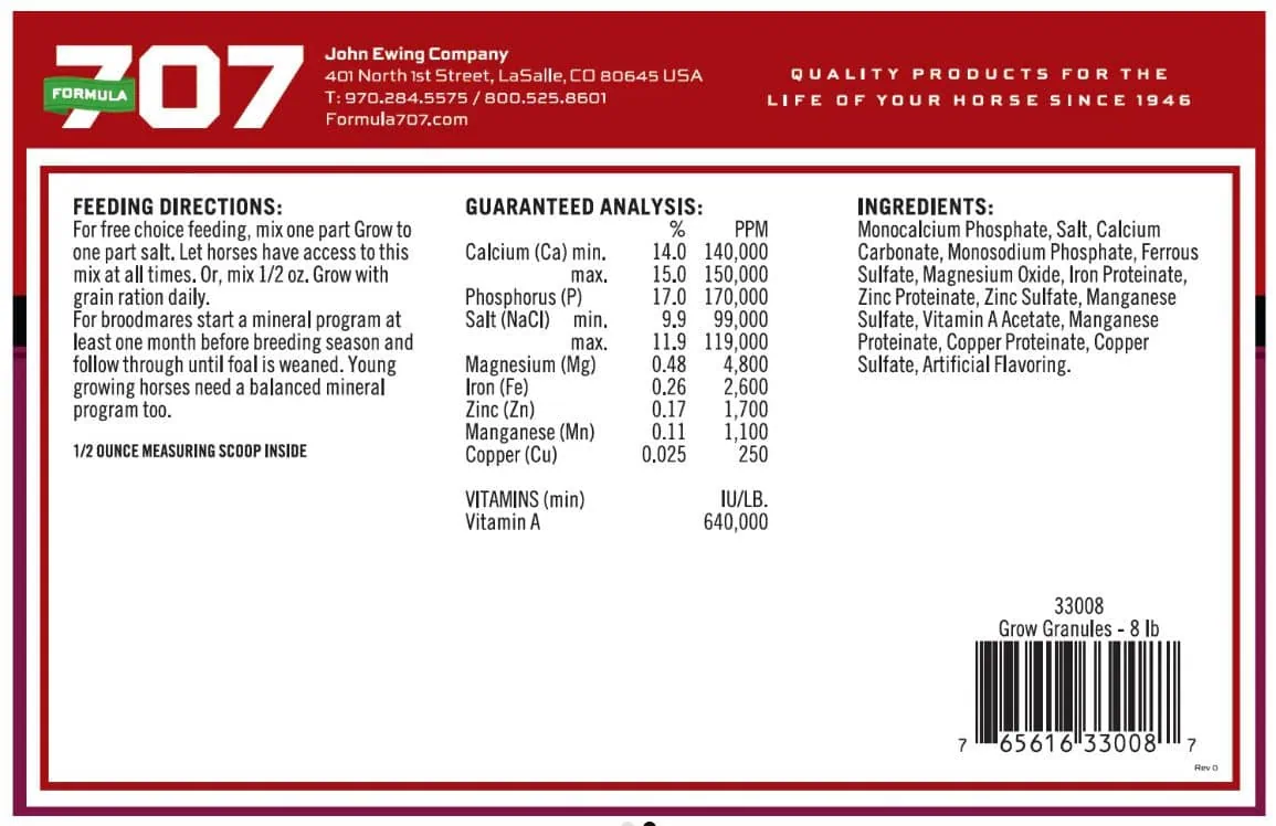 Grow Granules from Formula 707 is a mineral and vitamin supplement. It is intended for growing or young horses, and broodmares.