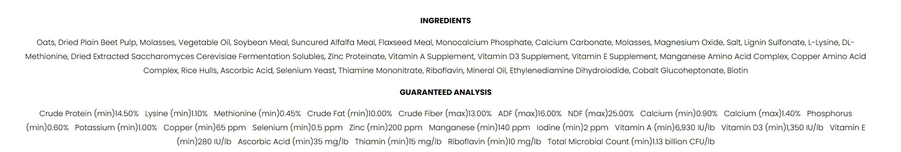 Ingredients: Oats, Beet Pulp, Molasses, Vegetable Oil, Soybean Meal, Alfalfa Meal, Ground Flaxseed (Linseed), Monocalcium Phosphate, Calcium Carbonate, Cane Molasses, Magnesium Oxide, Salt (Sodium Chloride), Lignin Sulfonate, L-Lysine, DL-Methionine, Saccharomyces cerevisiae Fermentation Products, Zinc Proteinate, Vitamin A Supplement, Cholecalciferol (Vitamin D3), Vitamin E Supplement, Manganese Amino Acid Complex, Copper Amino Acid Complex, Rice Hulls, Ascorbic Acid (Vitamin C Supplement), Selenium Yeast, Thiamine Mononitrate (Vitamin B1), Riboflavin (Vitamin B2), Mineral Oil, Ethylenediamine Dihydroiodide (EDDI), Cobalt Glucoheptonate Complex, Biotin