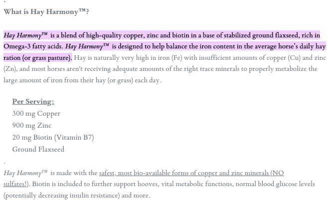 Hay Harmony by Yucc' it Up! is an equine supplement that provides copper, zinc, and biotin. These nutrients are important for hoof health and coat quality.