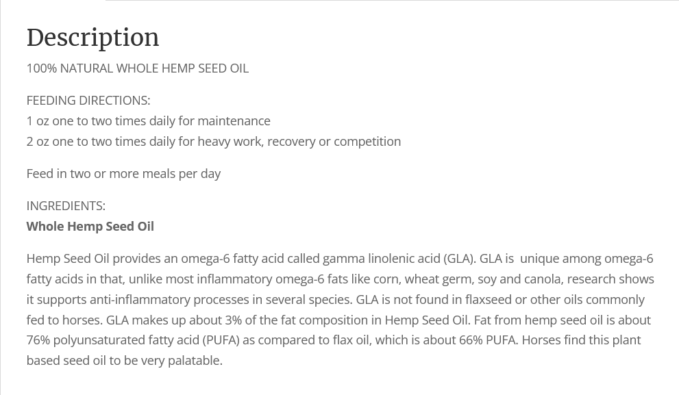 Hemp Seed Oil is a liquid supplement intended to provide omega-6 fatty acids. This supplement can be beneficial by supporting anti-inflammatory process in horses of all ages and work levels.