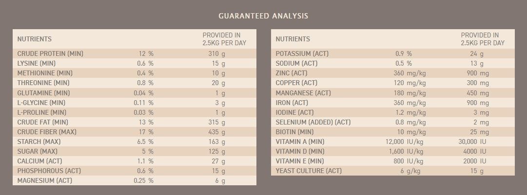| SulfurSulfur is a component of the amino acids methionine and cysteine. It is important for hoof health, joint function, coat quality and metabolic health. | -- | % DM | -- | g | ||