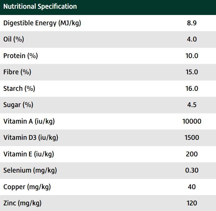 Ingredients: Wheat Middlings (Shorts), Oatfeed, Barley, Molasses, Rice Bran, Calcium Carbonate, Salt (Sodium chloride), Vitamin and Mineral Premix, Magnesium Oxide, Rapeseed oil