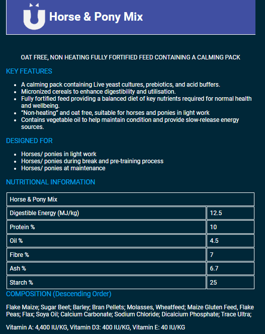 Horse and Pony Mix is an oat-free and micronized feed. It is ideal for horses and ponies of all ages and in light to moderate work. It contains 10% protein, 4.5% fat, and 7% fibre.