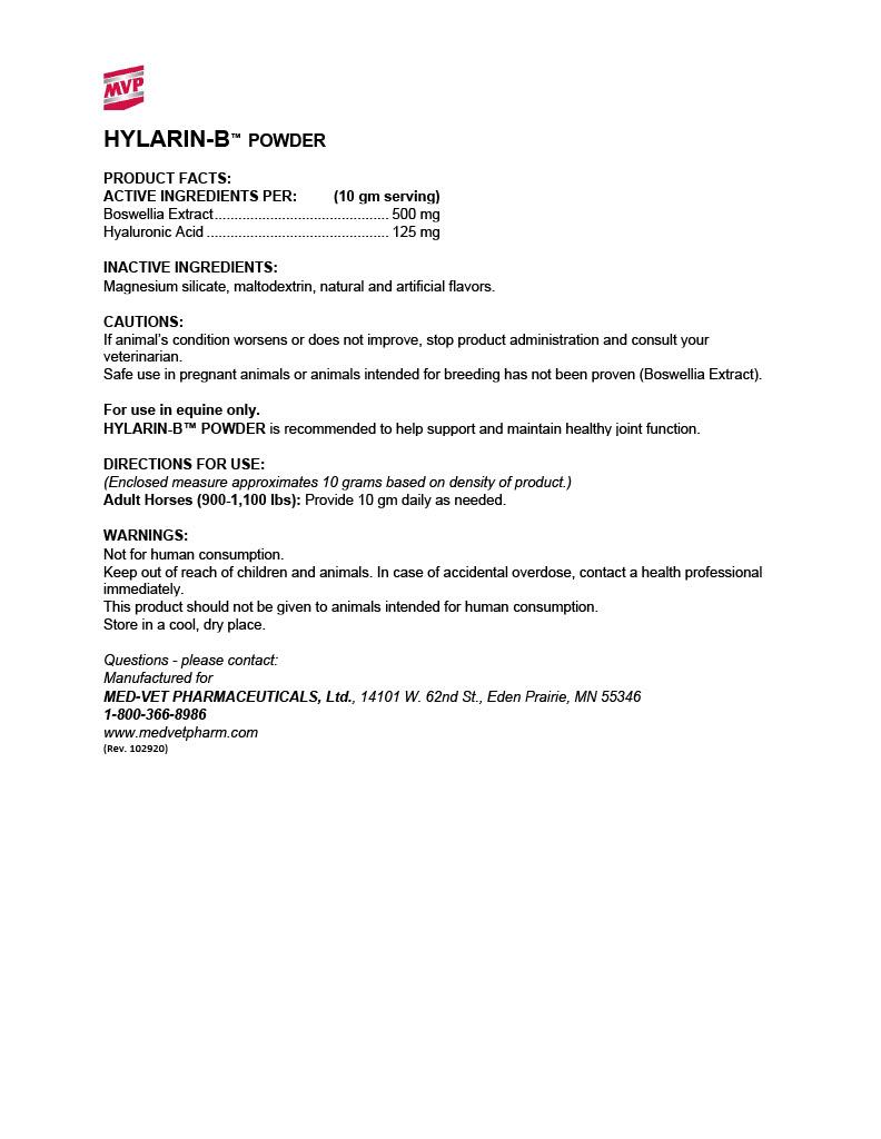 Hylarin-B by MVP is a powdered supplement for horses that intends to support and maintain joint function. Hyaluronic acid intends to support cartilage and joint fluid.