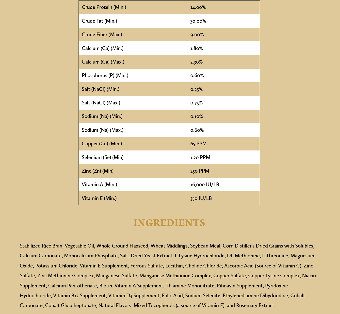 Ingredients: Rice Bran, Vegetable Oil, Ground Flaxseed (Linseed), Wheat Middlings (Shorts), Soybean Meal, Corn Distillers Dried Grains with Solubles, Calcium Carbonate, Monocalcium Phosphate, Salt (Sodium chloride), Yeast Extract, L-Lysine, DL-Methionine, L-Threonine, Magnesium Oxide, Potassium Chloride, Vitamin E Supplement, Ferrous Sulfate, Lecithin, Choline Chloride, Ascorbic Acid (Vitamin C Supplement), Zinc Sulfate, Zinc Methionine Complex, Manganese Sulfate, Manganese Methionine Complex, Copper Sulfate, Copper Lysine Complex, Niacin (Vitamin B3), Pantothenic Acid (Vitamin B5), Biotin, Vitamin A Supplement, Thiamine Mononitrate (Vitamin B1), Riboflavin (Vitamin B2), Pyridoxine Hydrochloride (Vitamin B6), Cobalamin (Vitamin B12), Cholecalciferol (Vitamin D3), Folic Acid (Vitamin B9), Sodium selenite, Ethylenediamine dihydroiodide (EDDI), Cobalt Carbonate, Cobalt Glucoheptonate Complex, Natural Flavors, Mixed Tocopherols, Rosemary Extract