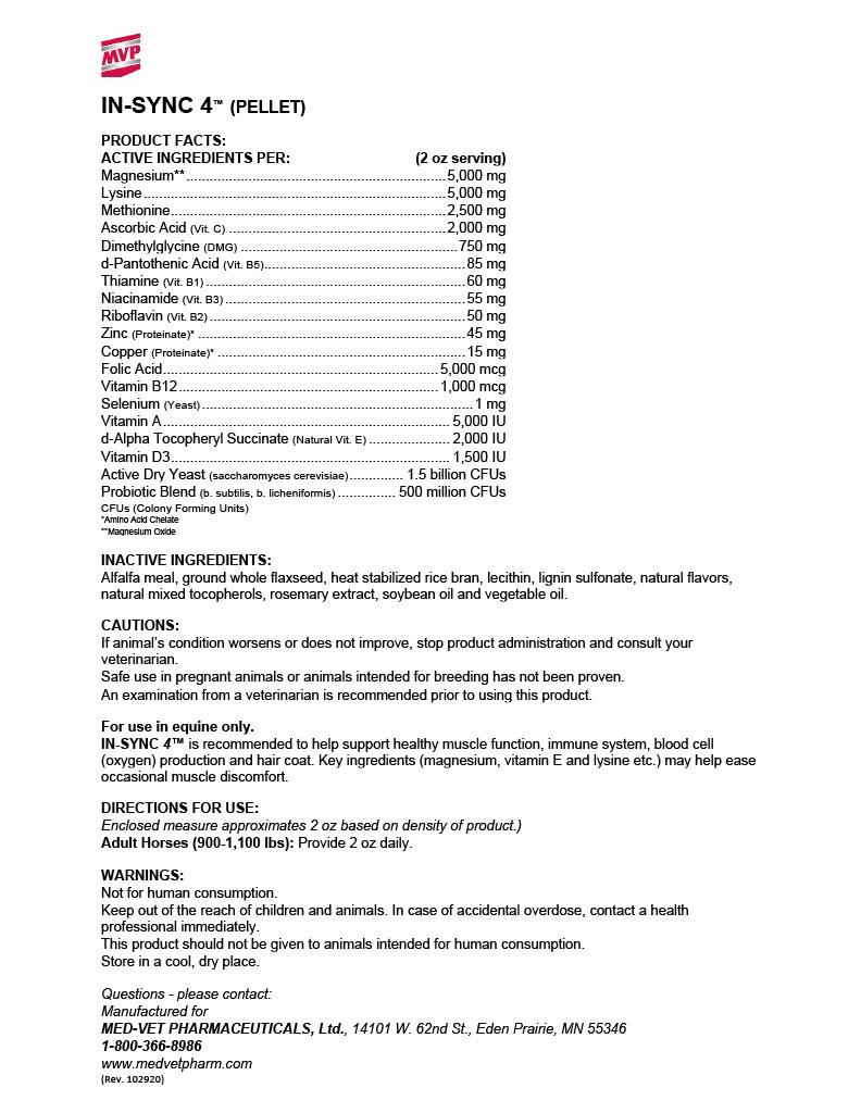 In-SYNC 4 from MVP is a supplement intended to support muscle function, immune health, blood cell production, and coat quality. It contains B-vitamins, amino acids, and vitamins.