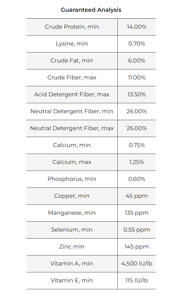 | SulfurSulfur is a component of the amino acids methionine and cysteine. It is important for hoof health, joint function, coat quality and metabolic health. | -- | % DM | -- | g | ||