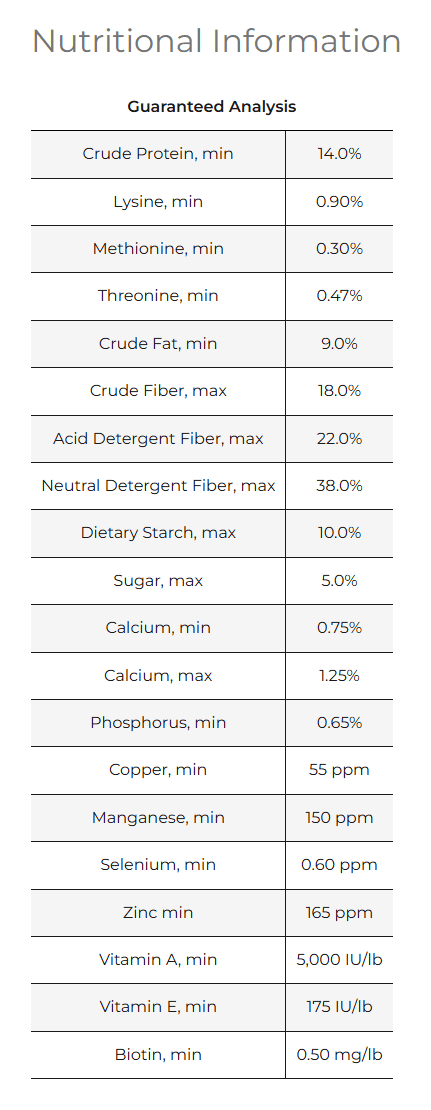 Ingredients: Wheat Middlings (Shorts), Soybean Hulls, Beet Pulp, Vegetable Oil, Alfalfa Meal, Flaxseed (Linseed), Soybean Meal, Lignin Sulfonate, Calcium Carbonate, Brewers Yeast, Salt (Sodium Chloride), Monocalcium Phosphate, L-Lysine, Calcite, Calcium Propionate, DL-Methionine, Magnesium Oxide, Yeast Extract, Vitamin E Supplement, Natural and Artificial Flavors, Yeast Culture, Dried Enterococcus faecium Fermentation Product, Dried Lactobacillus acidophilus Fermentation product, Dried Aspergillus oryzae Fermentation Product, Dried Trichoderma longibrachiatum Fermentation Product, Dried Bacillus subtilis Fermentation Extract, Selenium Yeast, Zinc Amino Acid Complex, Zinc Sulfate, Manganese Amino Acid Complex, Manganese Sulfate, Copper Sulfate, Copper Amino Acid Complex, Biotin, Rice Hulls, Cobalamin (Vitamin B12), L-Ascorbyl-2-Polyphosphate (Vitamin C), Ferrous Sulfate, Cobalt Glucoheptonate Complex, Niacin (Vitamin B3), Pantothenic Acid (Vitamin B5), Sodium Selenite, Riboflavin (Vitamin B2), Dried Bacillus subtilis Fermentation Product, Dried Bacillus licheniformis Fermentation Product, Choline Chloride, L-Threonine, Vitamin A Supplement, Pyridoxine Hydrochloride (Vitamin B6), Thiamine Mononitrate (Vitamin B1), Calcium Iodide, Folic Acid (Vitamin B9), Cholecalciferol (Vitamin D3), Menadione Sodium Bisulfate Complex (Source of Vitamin K), Cobalt Carbonate