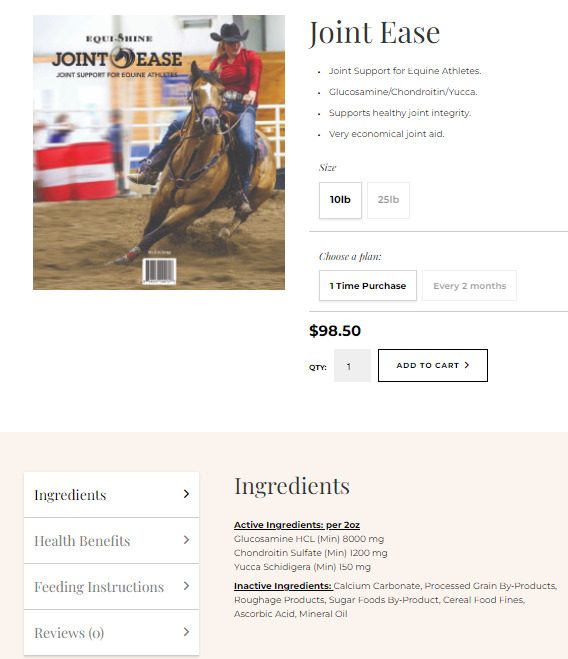 Joint Ease is a joint supplement intended for performance horses. It contains glucosamine, chondroitin, and yucca that intends to promote joint function.