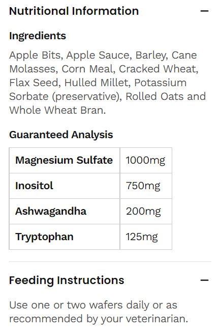 Ingredients: Apple, Apple Sauce, Barley, Cane Molasses, Corn Meal, Cracked Wheat, Flaxseed (Linseed), Hulled Millet, Potassium Sorbate, Oats, Wheat Bran, Magnesium Sulfate, Thiamine Mononitrate (Vitamin B1), Inositol, Ashwagandha (Withania Somnifera), L-Tryptophan