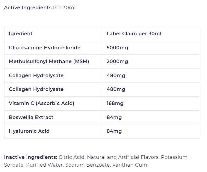 Ingredients: Glucosamine Hydrochloride, Methylsulfonylmethane (MSM), Hydrolyzed Collagen, Ascorbic Acid (Vitamin C Supplement), Boswellia Serrata Extract, Hyaluronic Acid, Citric Acid, Natural and Artificial Flavors, Potassium Sorbate, Water, Benzoic Acid, Xanthan Gum