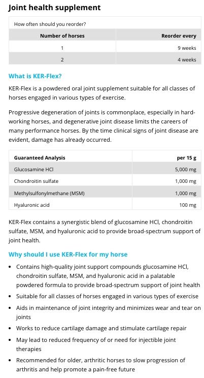 KER-Flex from Kentucky Equine Research is a powdered joint supplement for horses in all levels of work. KER-Flex contains chondroitin sulphate, MSM, hyaluronic acid and glucosamine HCl intended to support joint health in horses.