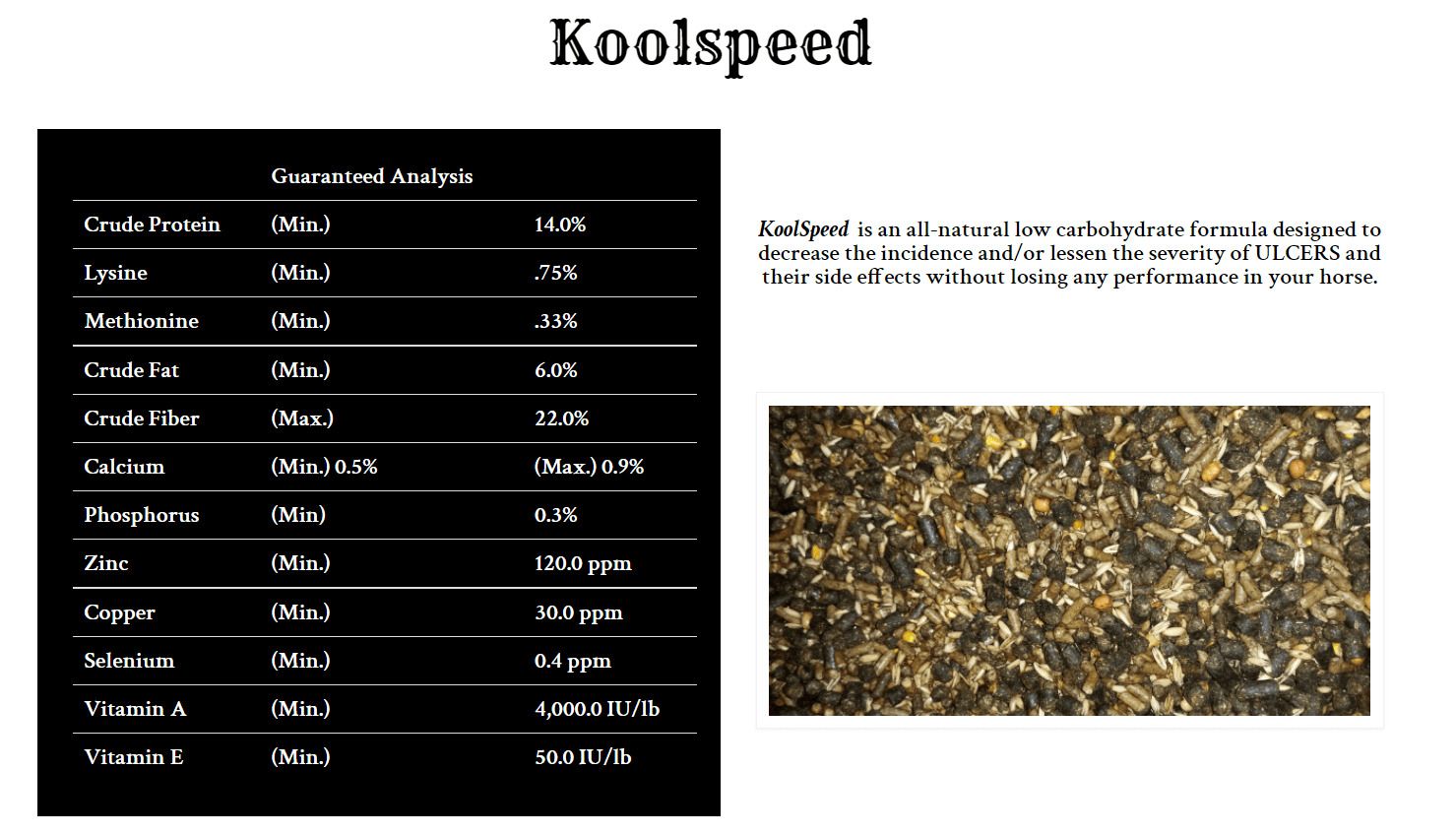 KoolSpeed Equine Performance Feed is a feed targeted to performance equine athletes to reduce the incidence of ulcers. It is formulated with digestible forage and fiber sources and is intended to slow down the rate of consumption.