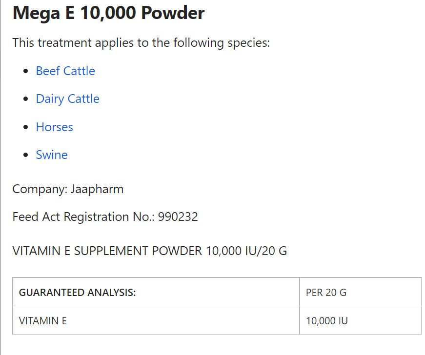 Mega E 10,000 is a powdered Vitamin E supplement used in horses and livestock species. Feeding 20 grams provides 10,000 IU of the antioxidant Vitamin E. It is unknown whether this is natural or synthetic vitamin E.