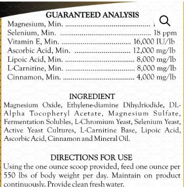 Ingredients: Magnesium Carbonate, Magnesium Oxide, Hydrolyzed Yeast, Extruded Soybeans, Vitamin E Supplement, Sodium Ascorbate, Acetyl L-carnitine, Alpha Lipoic Acid, Ascorbic Acid (Vitamin C Supplement), Molasses, Mineral Oil, Cinnamon, Selenium Yeast, Soybean Oil, Ethylenediamine dihydroiodide (EDDI)