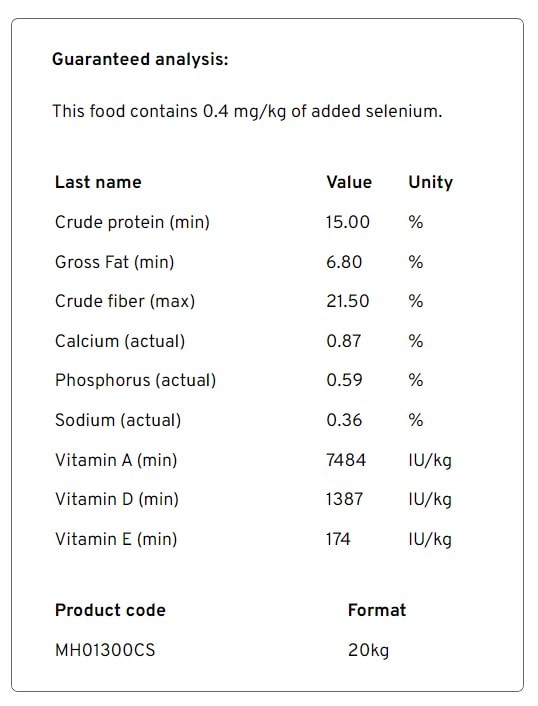 | Crude FiberCrude fibre indicates the maximum amount of indigestible fibres in your feed. | 23.9 | % DM | (max) | 215 | g | |