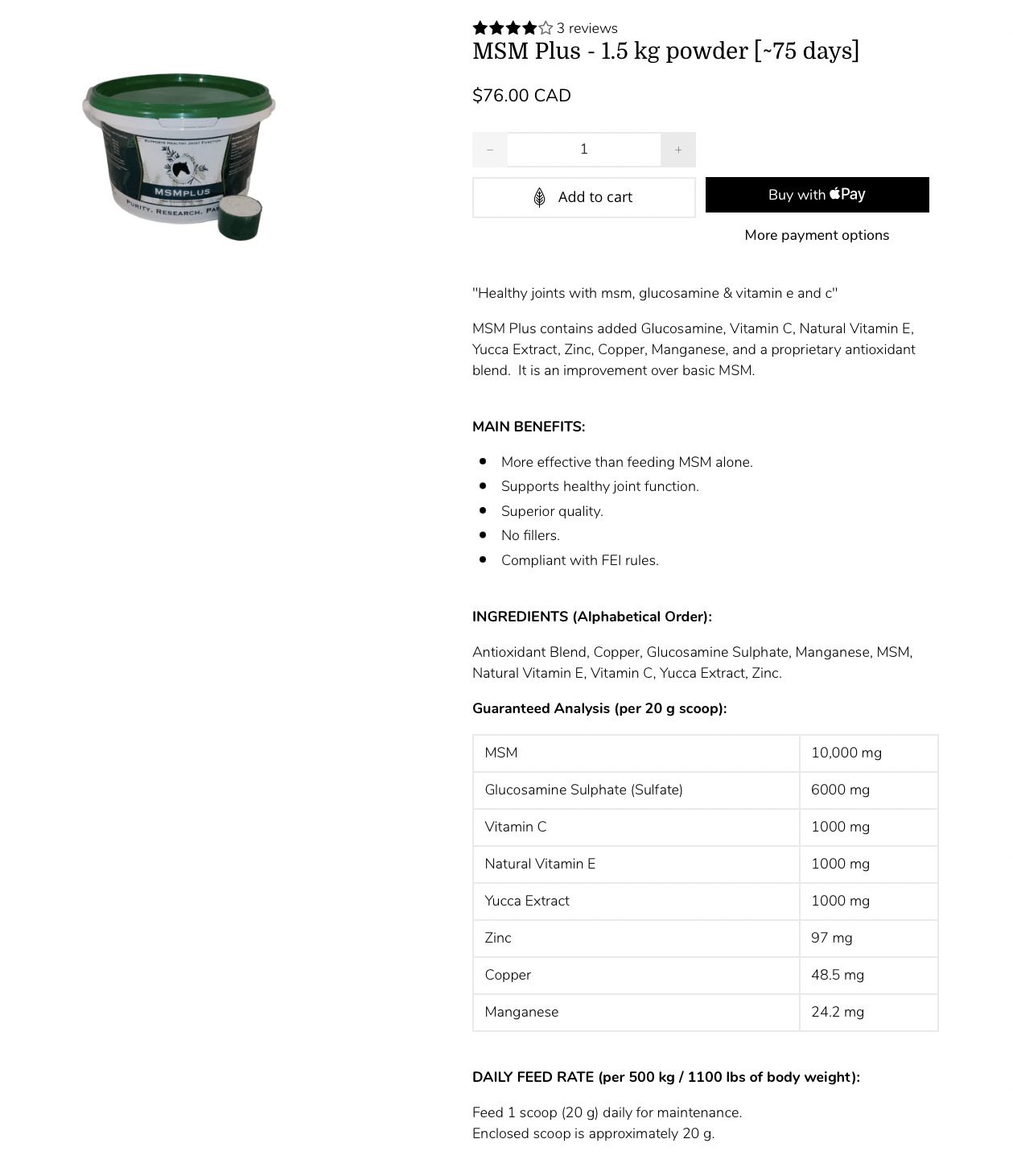 Ingredients: Antioxidants, Copper, Glucosamine Sulfate, Manganese, Methylsulfonylmethane (MSM), D-Alpha-Tocopherol (Natural Vitamin E), Ascorbic Acid (Vitamin C Supplement), Yucca schidigera Extract, Zinc