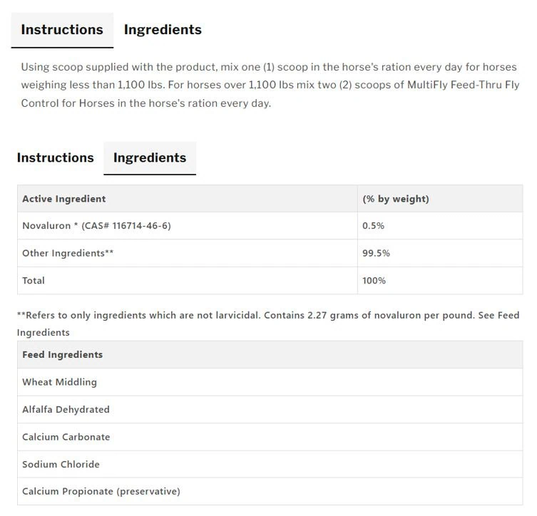 MultiFly Feed-Thru Fly Control from Formula 707 is a pelleted additive intended to decrease the fly load on horses. This supplement contains Novaluron.