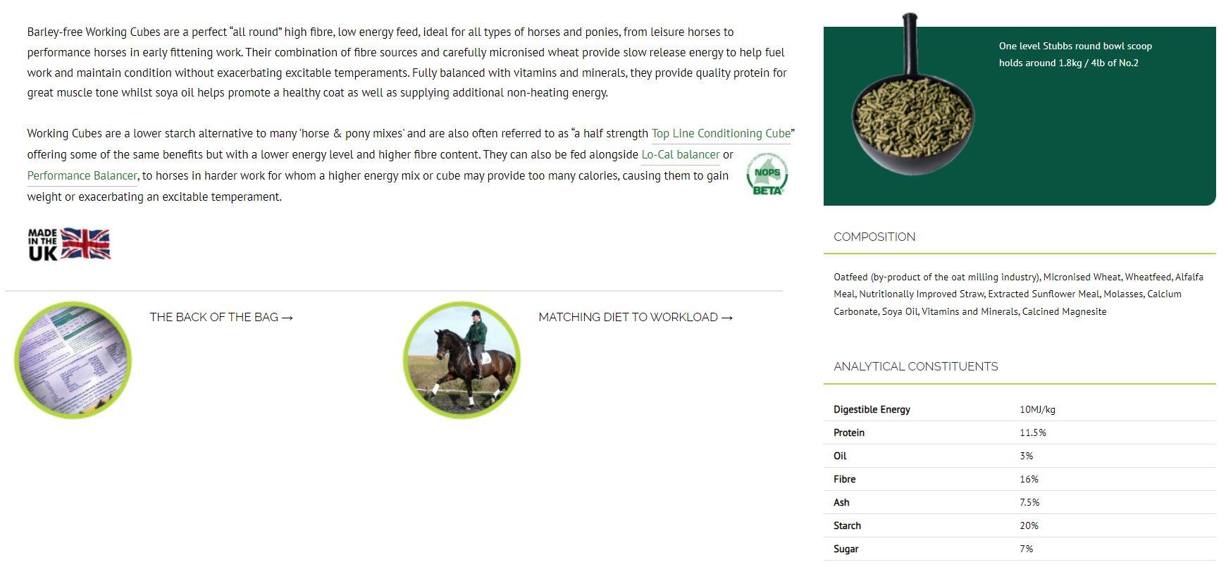 No.2 Working Cubes from Baileys Horse Feeds is intended for horses and ponies in competition, heavy work, and young horses beginning training. This feed is high in fiber and low in starch, ideal for the horses and ponies mentioned above.
