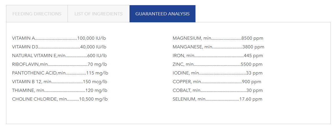 Ingredients: Alfalfa Meal, Ground Barley, Manganese Amino Acid Complex, Zinc Amino Acid Complex, Selenium Yeast, Zinc Oxide, Manganese Oxide, Rice Bran, Magnesium Oxide, Copper Amino Acid Complex, Choline Chloride, Vitamin E Supplement, Ferrous Sulfate, Copper Chloride, Molasses, Vitamin E Supplement, Canola Oil, Cobalt Glucoheptonate Complex, Thiamine (Vitamin B1), Pantothenic Acid (Vitamin B5), Vitamin A Supplement, Riboflavin (Vitamin B2), Cholecalciferol (Vitamin D3), Cobalt Sulfate, Ethylenediamine dihydroiodide (EDDI), Cobalamin (Vitamin B12)