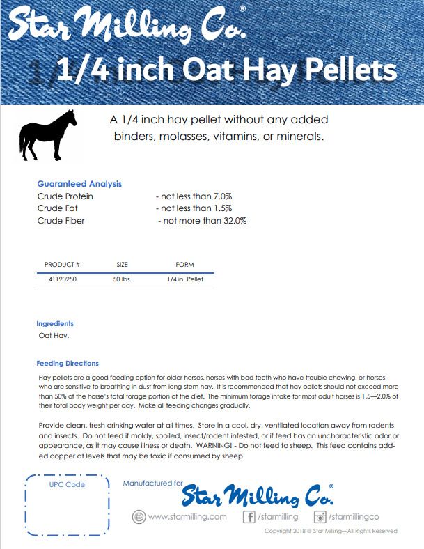 Oat Hay Pellets by Star Milling Co is a forage replacement pellet consisting of 100% chopped oat hay. It contains a minimum of 7% crude protein and contains no added minerals or vitamins.