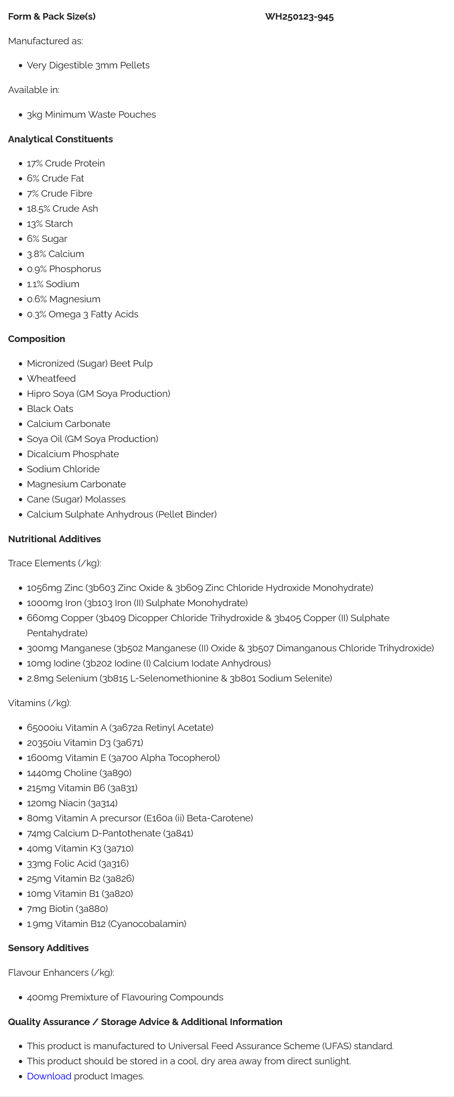 Disclaimer: Listing of a product in the Feed Bank does not imply endorsement or approval by Mad Barn. Products listed are not sold by Mad Barn and should not be construed as product offerings. All trademarks are the property of their respective owners. Although we endeavour to maintain the accuracy of nutritional information in our feed bank, the nutrient analysis may not be complete or accurate based on available information. Users are advised to use this information at their discretion and are encouraged to consult with professional nutritionists or a veterinarian for any specific recommendations or advice.