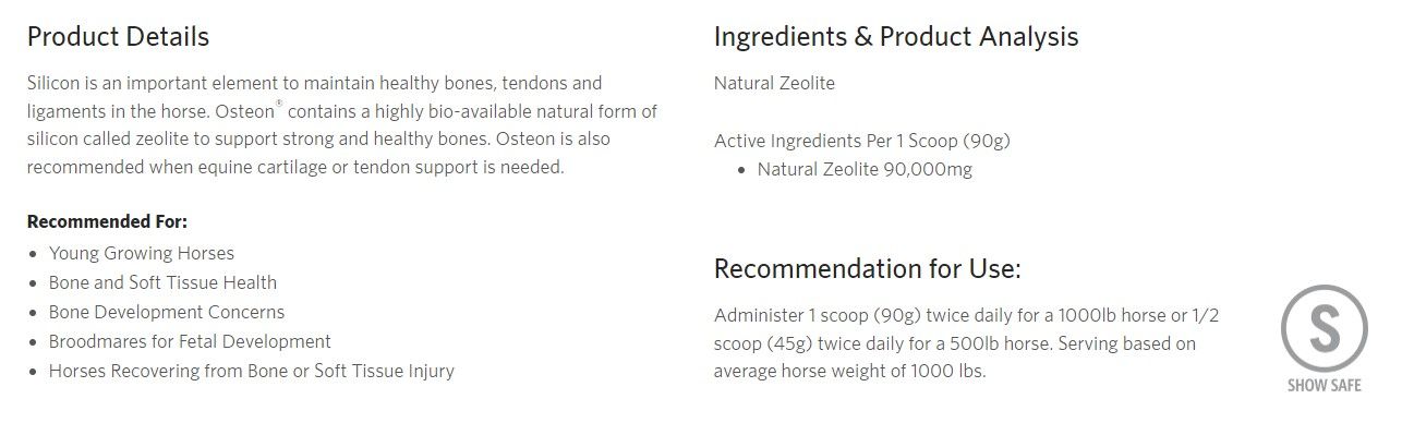 Osteon from Platinum Performance is a supplement that is meant to support healthy bones, tendons, and ligaments. It contains a natural form of silicon, zeolite. It can also help with recovery and broodmare health.