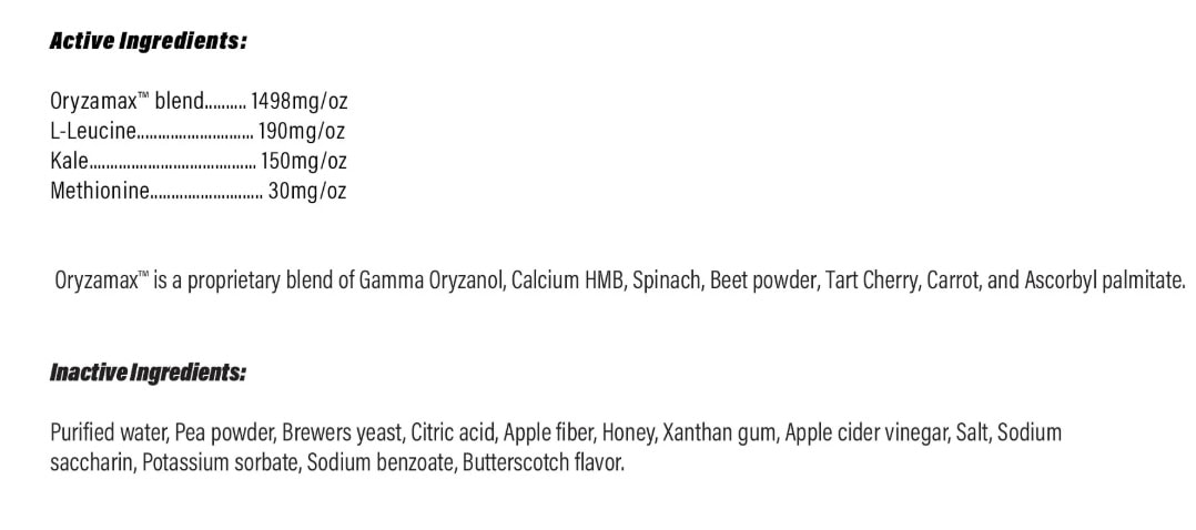 Ingredients: Water, Peas, Brewers Yeast, Citric Acid, Apple Fiber, Honey, Xanthan Gum, Apple Cider Vinegar, Salt (Sodium Chloride), Saccharin Sodium, Potassium Sorbate, Benzoic Acid, Flavor, Gamma Oryzanol, Hydroxymethylbutyrate (HMB), Spinach, Beetroot, Cherry Flavor, Carrots, Ascorbic Acid (Vitamin C Supplement)