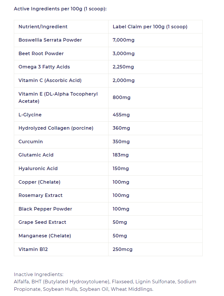 Ingredients: Boswellia Serrata Extract, Beetroot, Omega 3 Fatty Acids, Ascorbic Acid (Vitamin C Supplement), dl-Alpha Tocopherol (Synthetic Vitamin E), Glycine, Hydrolyzed Collagen, Curcumin Extract, L-Glutamine, Hyaluronic Acid, Organic Copper, Rosemary Extract, Black Pepper, Grapeseed Extract, Organic Manganese, Cobalamin (Vitamin B12), Alfalfa Meal, Butylated Hydroxytoluene (BHT), Flaxseed (Linseed), Lignin Sulfonate, Sodium Propionate, Soybean Hulls, Soybean Oil, Wheat Middlings (Shorts)