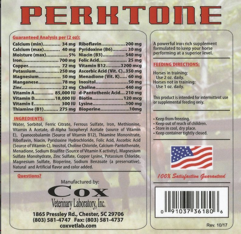 Perktone is a liquid iron supplement intended to help performance horses with their blood's ability to transport oxygen throughout the body. This may lead to improved performance.