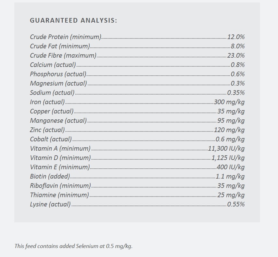 Ingredients: Soybean Hulls, Wheat Middlings (Shorts), Oat Hulls, Corn Gluten Meal, Corn Distillers Dried Grains with Solubles, Barley Flour, Vegetable Oil, Wheat Flour, Ground Flaxseed (Linseed), Molasses, Calcium Carbonate, Pellet binder, Salt (Sodium chloride), Monocalcium Phosphate, Organic Trace Minerals, Vitamin E Supplement, Vitamin A Supplement, Cholecalciferol (Vitamin D3), Vitamin K Supplement, Pantothenic Acid (Vitamin B5), Selenium Yeast, Choline Chloride, Niacin (Vitamin B3), Biotin, Riboflavin (Vitamin B2), Mineral Oil, Thiamine (Vitamin B1), Pyridoxine Hydrochloride (Vitamin B6), Cobalamin (Vitamin B12), Folic Acid (Vitamin B9), Antioxidants, Ethylenediamine dihydroiodide (EDDI), Dried Yeast, Yeast Culture, Flavor, Mold Inhibitor