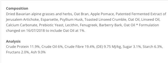 Ingredients: Chopped Grass Hay, Oat Bran, Apple Pomace, Jerusalem Artichoke, Sainfoin forage, Psyllium Husk, Ground Flaxseed (Linseed), Oat Oil, Flaxseed (Linseed) Oil, Calcium Carbonate, Yeast Culture, Lecithin, Fenugreek, Barberry Bark (Berberis vulgaris)