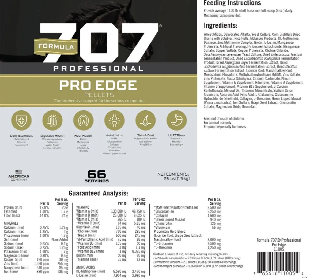 Ingredients: Wheat Middlings (Shorts), Alfalfa, Yeast Culture, Corn Distillers Dried Grains With Solubles, Rice Hulls, Molasses, DL-Methionine, Dextrose, Zinc Methionine Complex, Biotin, L-Lysine, Manganese Proteinate, Artificial Flavor, Pyridoxine Hydrochloride (Vitamin B6), Manganese Sulfate, Copper Sulfate, Copper Proteinate, Choline Chloride, Saccharomyces cerevisiae, Dried Enterococcus faecium Fermentation Product, Dried Lactobacillus acidophilus Fermentation product, Dried Aspergillus niger Fermentation Extract, Dried Trichoderma longibrachiatum Fermentation Extract, Dried Bacillus subtilis Fermentation Extract, Licorice, Marshmallow Root, Monosodium Phosphate, Methylsulfonylmethane (MSM), Zinc Sulfate, Zinc Proteinate, Yucca schidigera, Calcium Carbonate, Niacin (Vitamin B3), Vitamin E Supplement, Riboflavin (Vitamin B2), Vitamin A Supplement, Vitamin D Supplement, Cobalamin (Vitamin B12), Pantothenic Acid (Vitamin B5), Mineral Oil, Thiamine Mononitrate (Vitamin B1), Sodium Silico Aluminate, Ascorbic Acid (Vitamin C Supplement), Folic Acid (Vitamin B9), L-Glutamine, Glucosamine Hydrochloride, Collagen, L-Threonine, Perna canaliculus (Green Lipped Mussel), Ferrous Sulfate, Grapeseed Extract, Chondroitin Sulfate, Magnesium Oxide, Bromelain