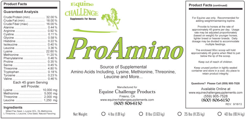 ProAmino from Equine Challenge is a supplement containing amino acids and omegas 3 and 6. It is intended for growing, pregnant, or lactating horses and can assist with muscle health and recovery.