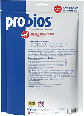 Probios Horse Soft Chews is a probiotic supplement in treat form for horses. Each 10 gram chew supplies a minimum of 150 million CFUs of probiotics (Bacillus subtilis and Bacillus licheniformis). The treats are apple-flavoured and sweetened with molasses and corn starch. It is recommended to feed 1-2 treats daily.