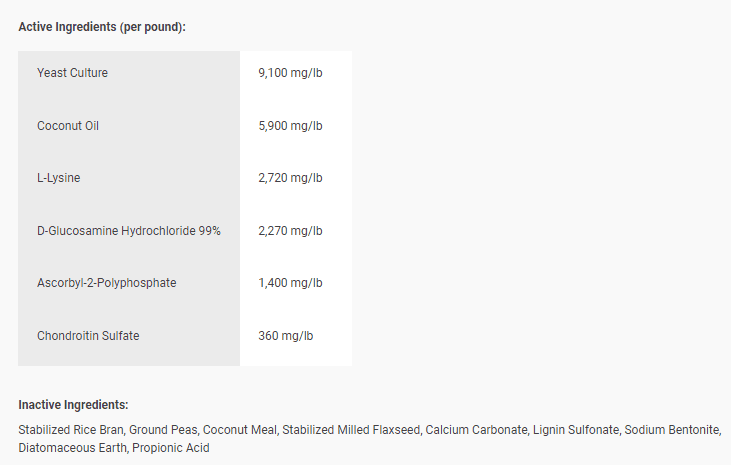 Ingredients: Rice Bran, Peas, Coconut (Copra) Meal, Ground Flaxseed (Linseed), Calcium Carbonate, Lignin Sulfonate, Bentonite clay, Diatomaceous Earth, Propionic Acid, Yeast Culture, Coconut Oil, L-Lysine, Glucosamine Hydrochloride, L-Ascorbyl-2-Polyphosphate (Vitamin C), Chondroitin Sulfate