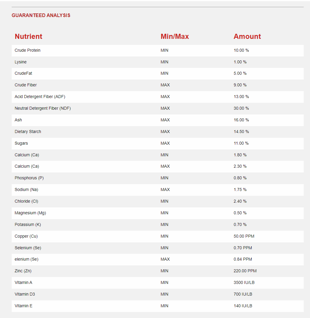 Ingredients: Wheat Middlings (Shorts), Beet Pulp, Barley, Carrots, Marine-Derived Calcium, Salt (Sodium Chloride), Soybean Oil, Flaxseed (Linseed), Magnesium Oxide, L-Lysine, Dicalcium Phosphate, Cane Molasses, Beet Molasses, Vitamin E Supplement, Cholecalciferol (Vitamin D3), Zinc Oxide, Copper Sulfate, Vitamin A Supplement, Calcium Iodide, Calcium Carbonate, Cobalt Carbonate, Ferrous Carbonate, Manganese Oxide, Sodium Selenite