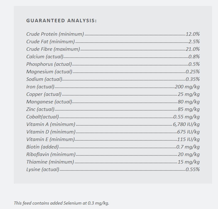 | SulfurSulfur is a component of the amino acids methionine and cysteine. It is important for hoof health, joint function, coat quality and metabolic health. | 0.26 | % DM | 14.6 | g | ||