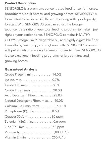 SeniorGLO is a concentrated feed formulated with highly digestible fiber, beet pulp, and soybean hulls. This soft pellet is designed to be easily consumed by senior horses and contains Butyric acid to support overall gut health.