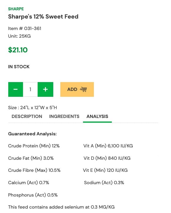 Sharpe 12% Sweet Feed is a 12% crude protein multi-particle blend coated in molasses. Sweet feeds are high in NSC but may be used to increase the palatability of certain medications, supplements, or rations.