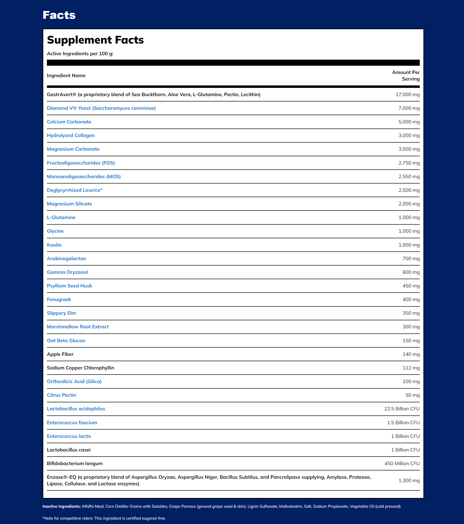 | Soluble FiberSoluble fibers are easily digestible by the horse. They are broken down into sugars and absorbed from the gut. | 50 | % DM | (est) | 475 | g | |