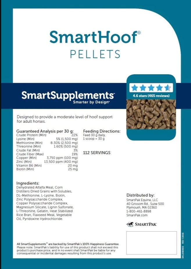 SmartHoof® Pellets by SmartPak is a pelleted hoof supplement containing 25 mg of biotin and methionine, lysine, threonine, and gelatin. This supplement provides the necessary nutrient to grow strong, resilient hooves.