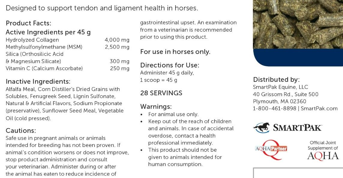 SmartTendon Pellets is a pelleted supplement that is built to support ligaments and tendons. It contains collagen, silica, and vitamin C.