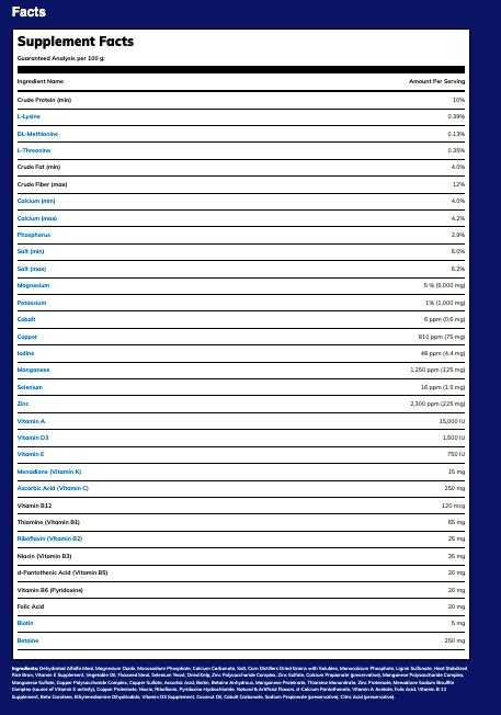 Ingredients: Alfalfa Meal, Magnesium Oxide, Monosodium Phosphate, Calcium Carbonate, Salt (Sodium chloride), Corn Distillers Dried Grains with Solubles, Monocalcium Phosphate, Lignin Sulfonate, Rice Bran, Vitamin E Supplement, Vegetable Oil, Ground Flaxseed (Linseed), Selenium Yeast, Dried Kelp, Zinc Polysaccharide Complex, Zinc Sulfate, Calcium Propionate, Manganese Polysaccharide Complex, Manganese Sulfate, Copper Polysaccharide Complex, Copper Sulfate, Ascorbic Acid (Vitamin C Supplement), Biotin, Betaine, Manganese Proteinate, Thiamine Mononitrate (Vitamin B1), Zinc Proteinate, Menadione Sodium Bisulfate Complex (Source of Vitamin K), Copper Proteinate, Niacin (Vitamin B3), Riboflavin (Vitamin B2), Pyridoxine Hydrochloride (Vitamin B6), Natural and Artificial Flavors, Pantothenic Acid (Vitamin B5), Retinyl Acetate (Vitamin A), Folic Acid (Vitamin B9), Cobalamin (Vitamin B12), Beta-Carotene, Ethylenediamine dihydroiodide (EDDI), Cholecalciferol (Vitamin D3), Coconut Oil, Cobalt Carbonate, Sodium Propionate, Citric Acid
