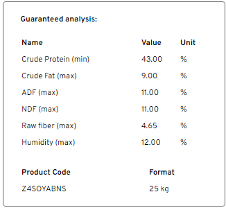 | Crude ProteinCrude Protein is an estimate of the total protein content of a feed based on the nitrogen content. | 48.9 | % DM | (min) | 430 | g | |