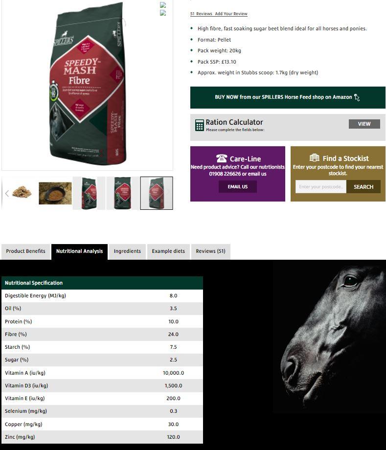Speedy-Mash Fibre from Spillers Feed is high in fiber and low in sugar and starches. This feed is intended for all horses and ponies, including those prone to laminitis.